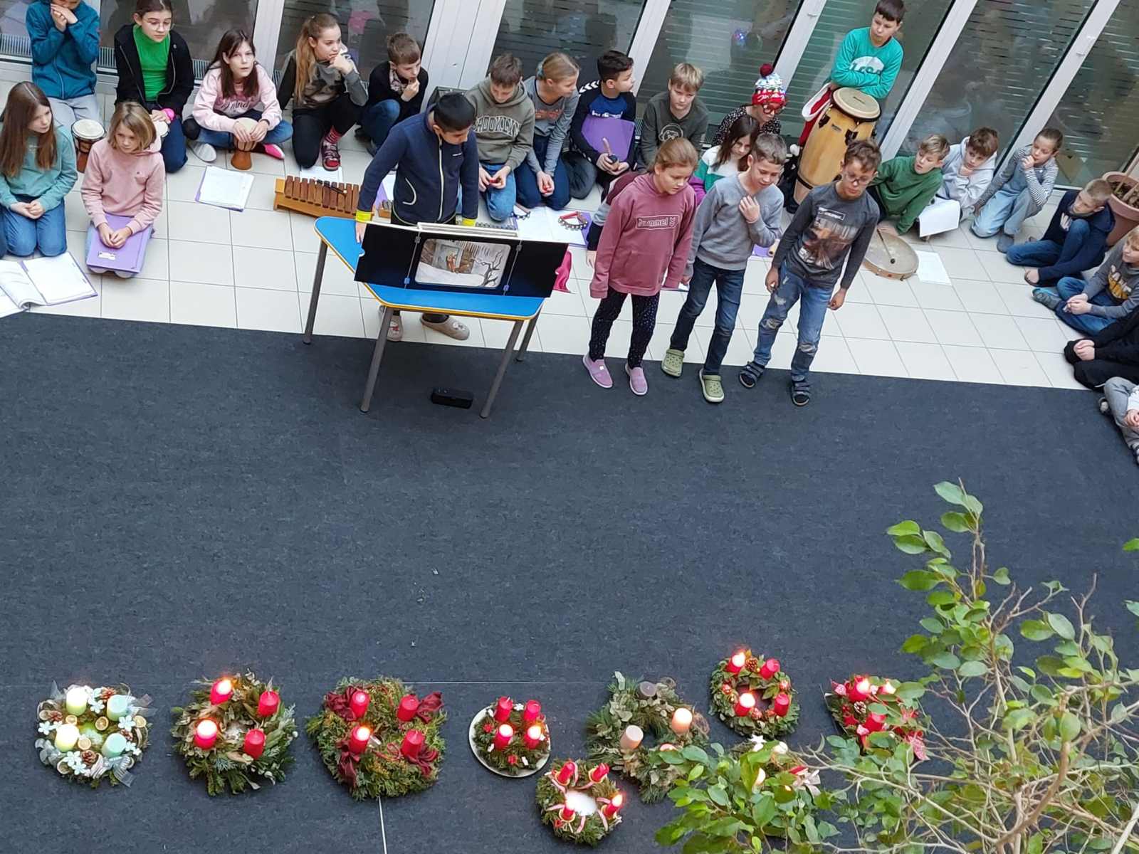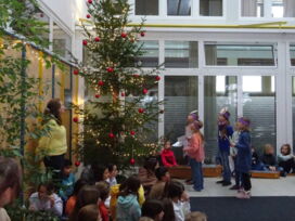 Ja, und am ersten Adventsmontag ging es dann auch wieder los mit den morgendlichen Adventsfeiern der Grundschulklassen im Lichthof. Jeden Montag ist eine andere Jahrgangsstufe dran und stimmt die Schule mit besinnlichen Liedern und Beiträgen auf die Weihnachtszeit ein.
