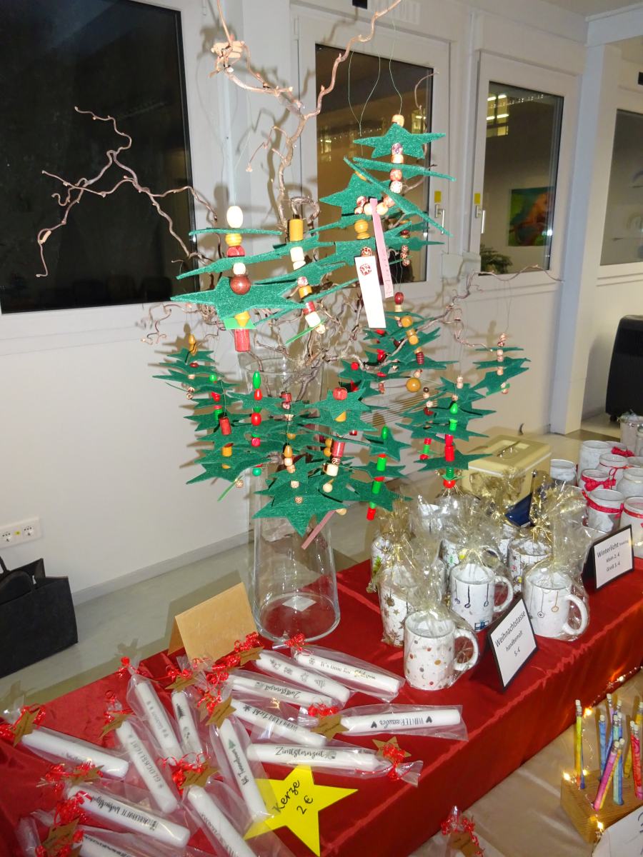 Der Adventsbasar fand heuer draußen in der neuen Container-Anlage statt. Unser Konrektor Robert Stiglmeier hatte einen wunderschönen großen Stern geschreinert, der den Weg wies. Mittlerweile ist der Stern ins Schulhaus umgezogen und ziert jetzt den Gang vor dem Sekretariat.
