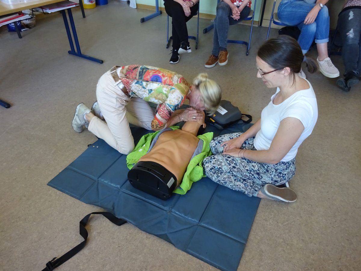 Am 24. und 25. Mai absolvierte das Kollegium der Jakob-Ihrler-Schule gemeinsam einen Erste-Hilfe-Kurs. Durchgeführt wurde der Kurs von Herrn Fleischmann vom BRK. Von der stabilen Seitenlage bis zur Herzdruckmassage reichte das Trainingsprogramm.