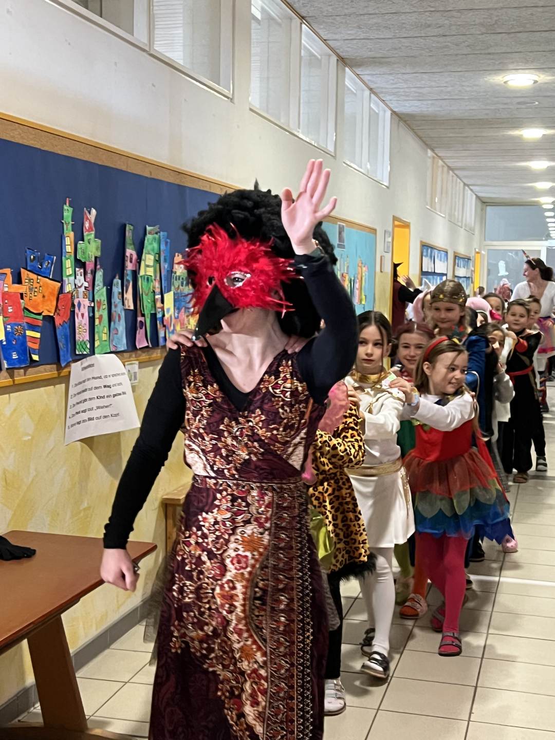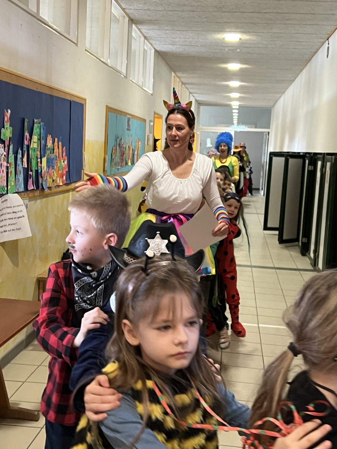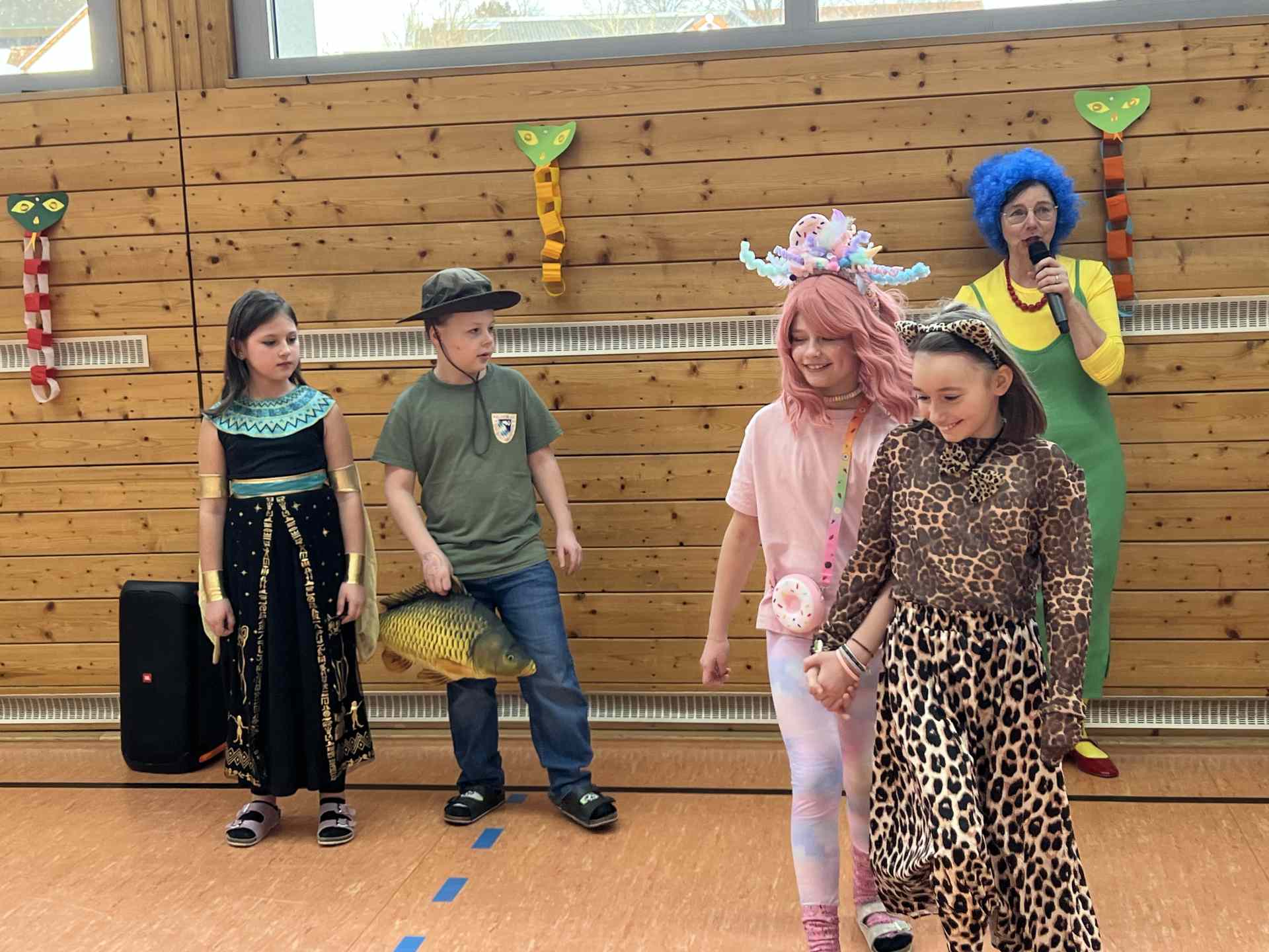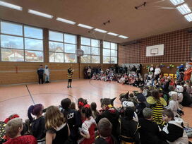 Zum Start zog wieder die allseits beliebte Polonaise durch das Schulhaus, die schließlich in der Turnhalle endete. Dort wurden alle Schülerinnen, Schüler und Lehrkräfte herzlich begrüßt, bevor das abwechslungsreiche Programm begann.