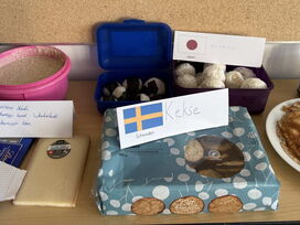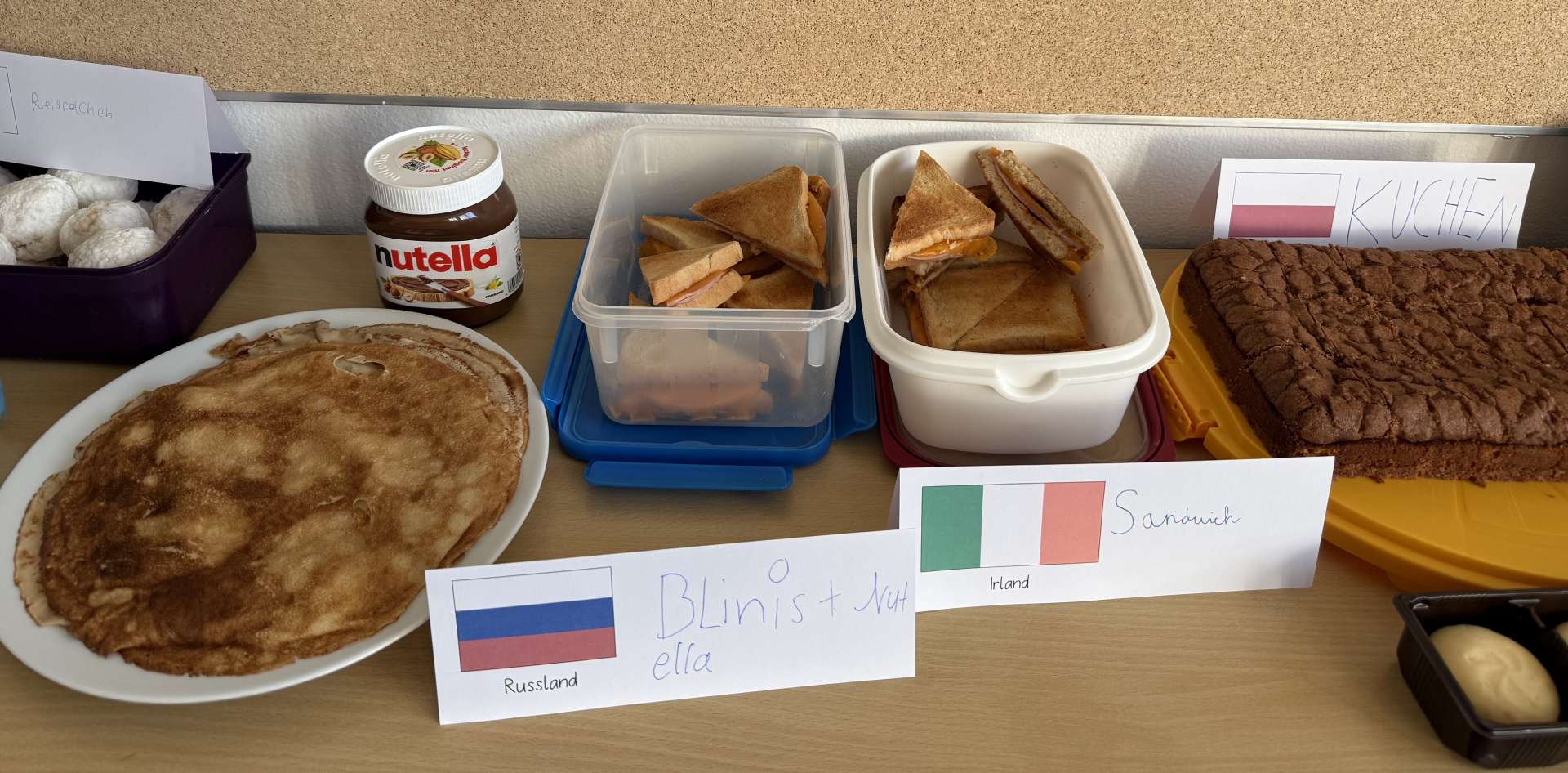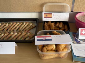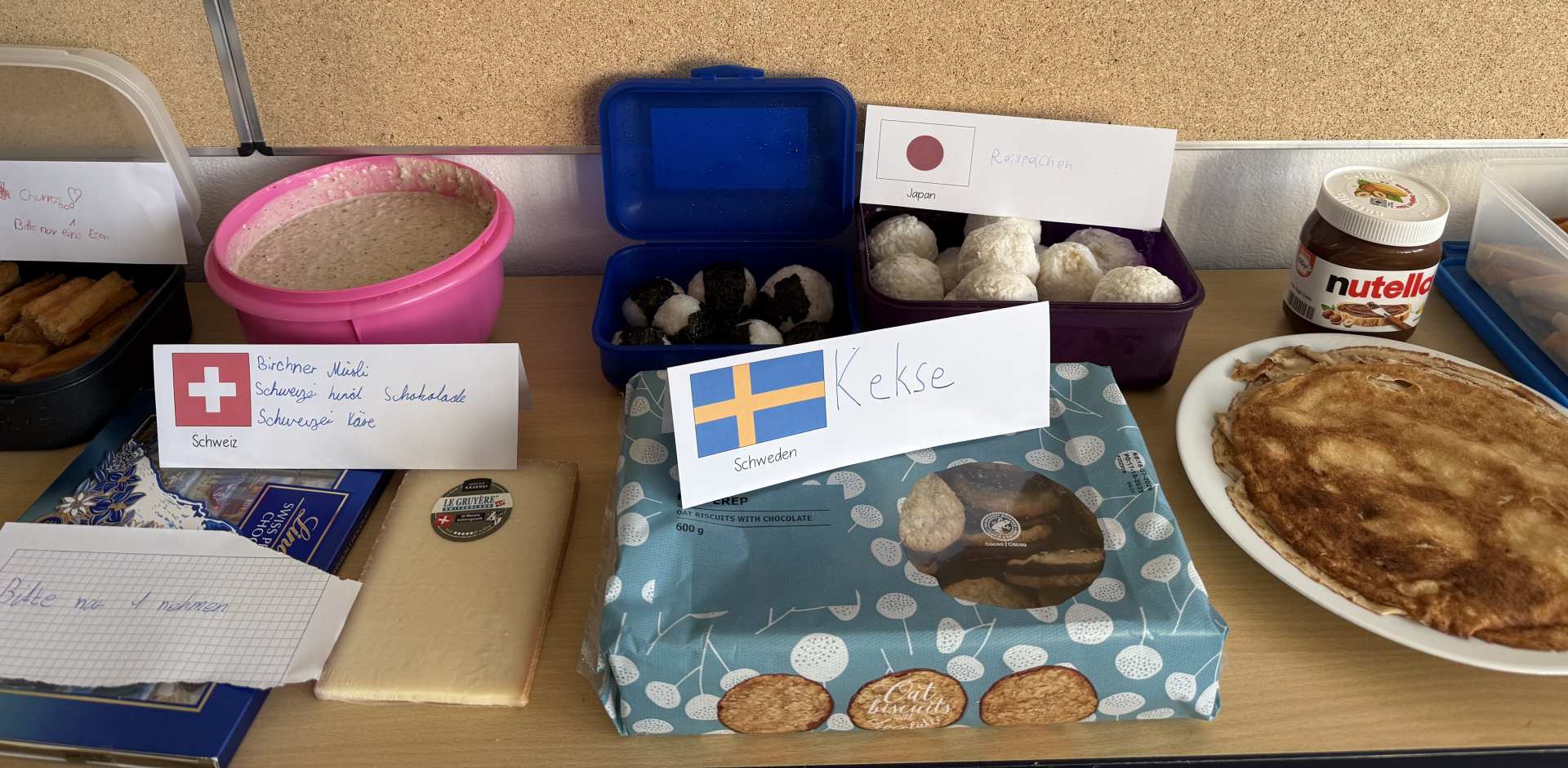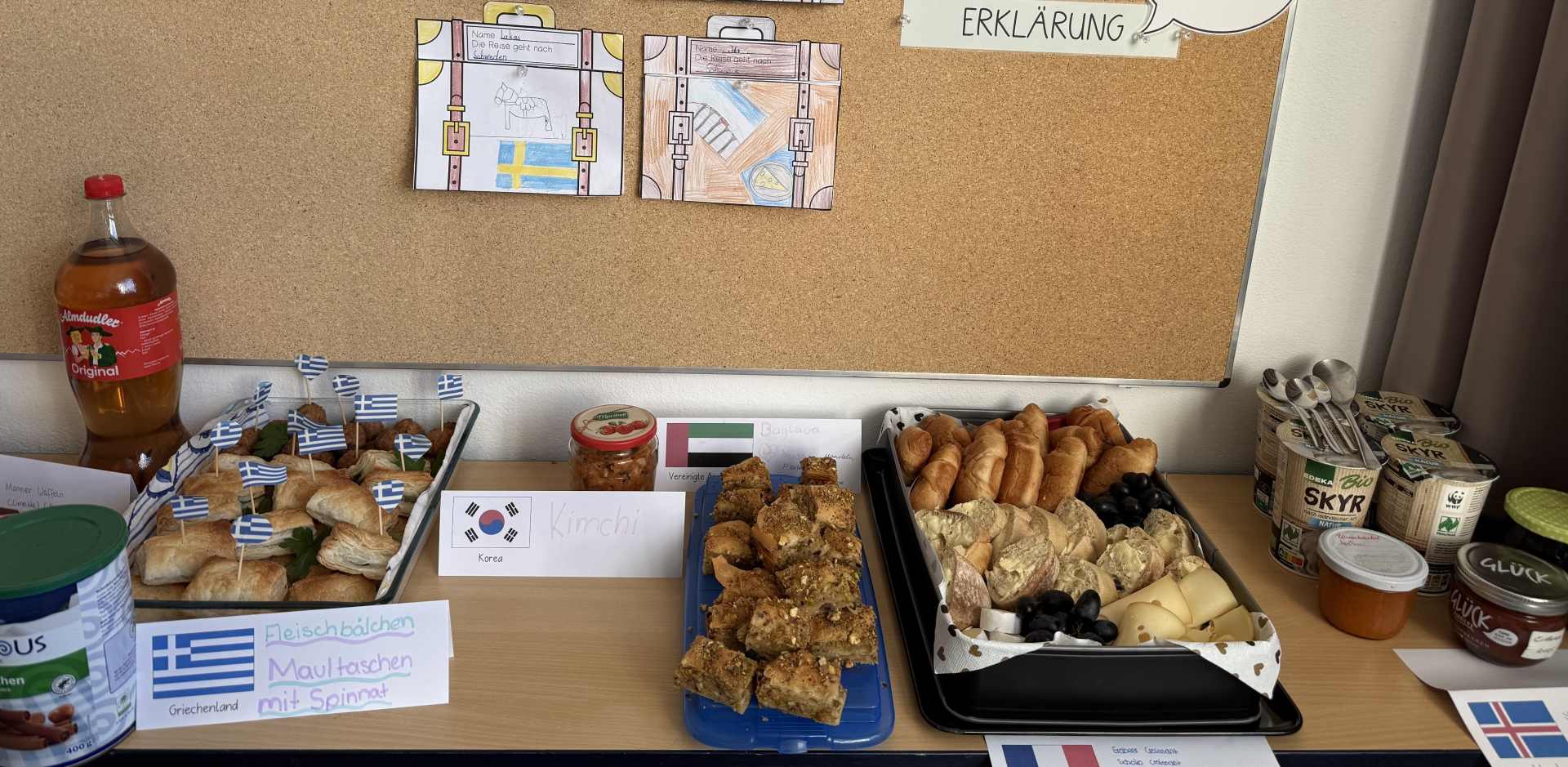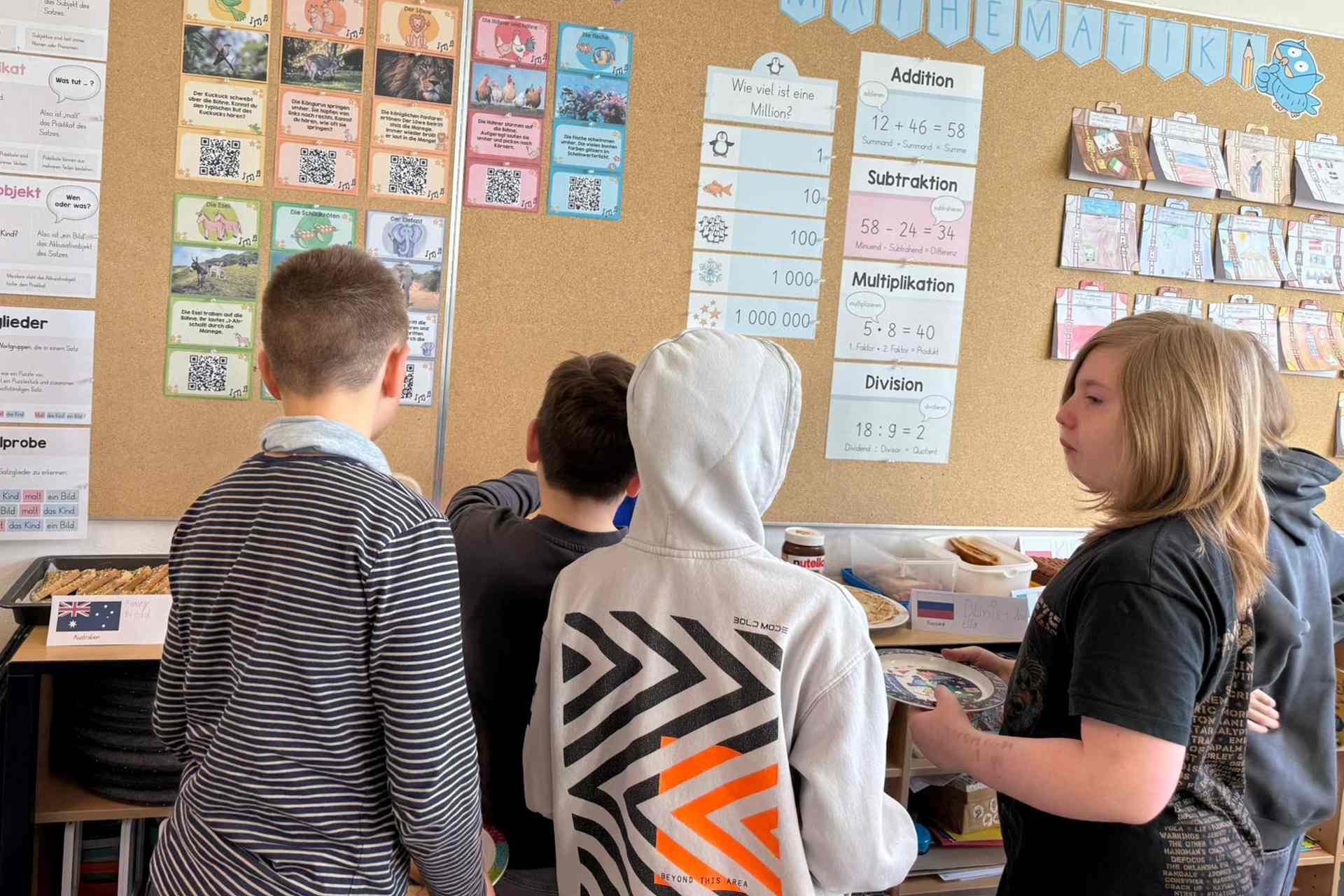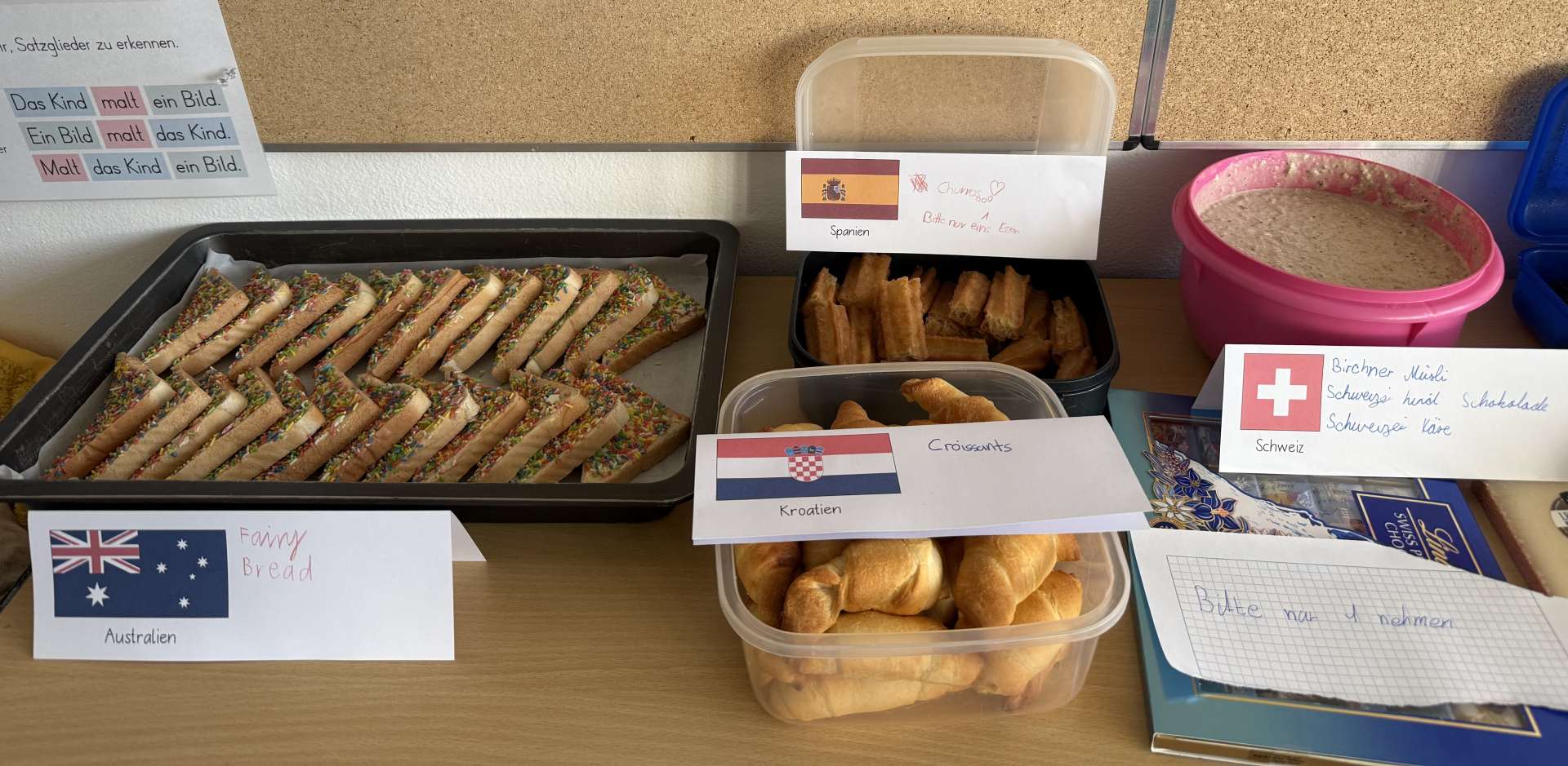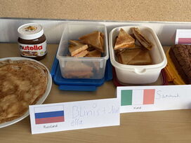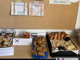 Den gelungenen Abschluss der Unterrichtsreihe bildete am Freitag, den 6. März, ein gemeinsames Länderfrühstück. Jedes Kind brachte passend zu seinem gewählten Land eine landestypische Speise mit. So entstand ein beeindruckend vielfältiges Buffet: Von Bircher Müsli (Schweiz) über Baklava (Vereinigte Arabische Emirate) und Blinis (Russland) bis hin zu Reisbällchen (Japan) und Kimchi (Korea) war für jeden Geschmack etwas dabei.