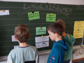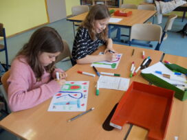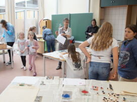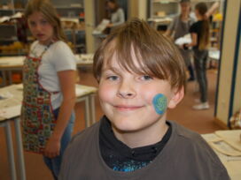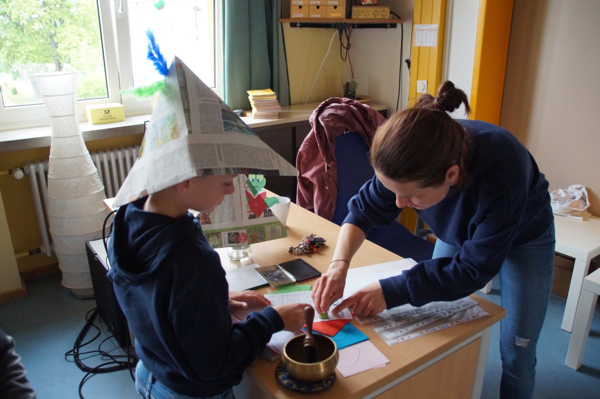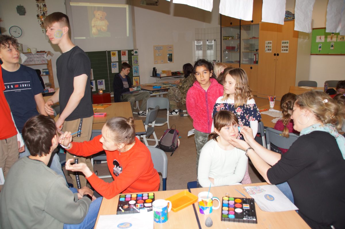 Anschließend erhielten die Kinder in ihren Klassenzimmern die Laufzettel ausgehändigt und starteten los. Jeder bewältigte so viele Stationen wie er mochte und konnte. Alles drehte sich auf vielfältige Weise ums Lesen, von der jüdischen Thora-Rolle bis zu den modernen Medien und dem Internet. Es wurde gebastelt, geschminkt, gerätselt, gestaltet, gedruckt, gesportelt, gelauscht, geschrieben, nachgedacht und natürlich gelesen, gelesen, gelesen!
