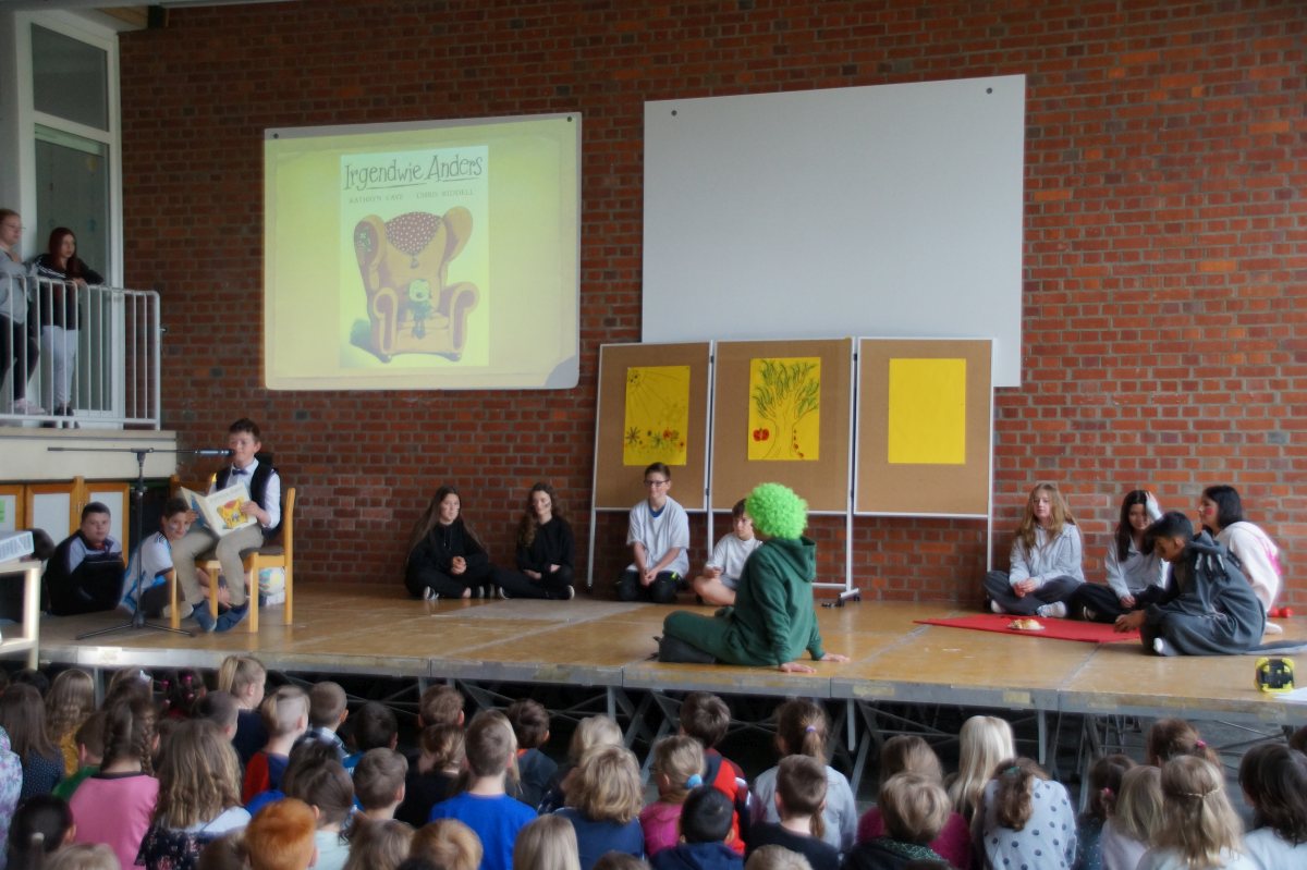 Zu Beginn führte die 6. Klasse in der Aula das Theaterstück „Irgendwie Anders“ nach dem gleichnamigen Bilderbuch von Kathryn Cave und Chris Riddell auf. In der berührenden Geschichte geht es um Außenseiter, das Anderssein und die Bedeutung von Toleranz.