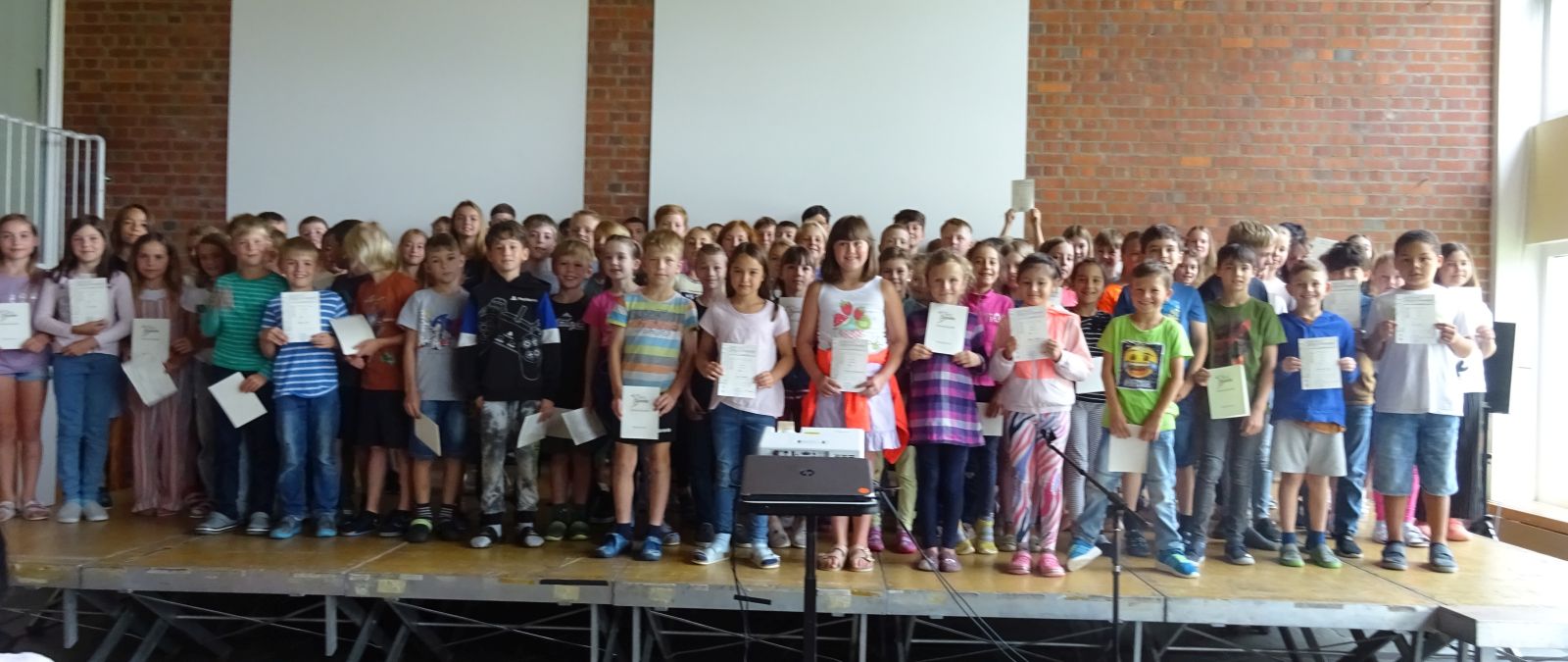 Große Urkundenverleihung in der Aula der Jakob-Ihrler-Schule. In der letzten Schulwoche wurden die Punktbesten des Sportfests und des Antolin-Lese-Programms geehrt und erhielten besondere Urkunden für die erbrachten Leistungen.